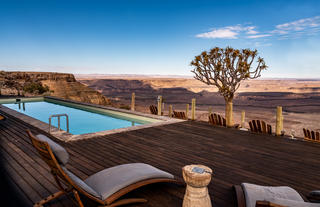 Fish River Lodge is the only lodge situated directly at the Fish River Canyon, the second-largest canyon in the world. Visitors can enjoy breathtaking views of this natural wonder from here. The 20 private chalets are scattered along the edge of the canyon around the Main Lodge. The beds are positioned facing the majestic gorge, offering guests the best possible views, especially in the morning!