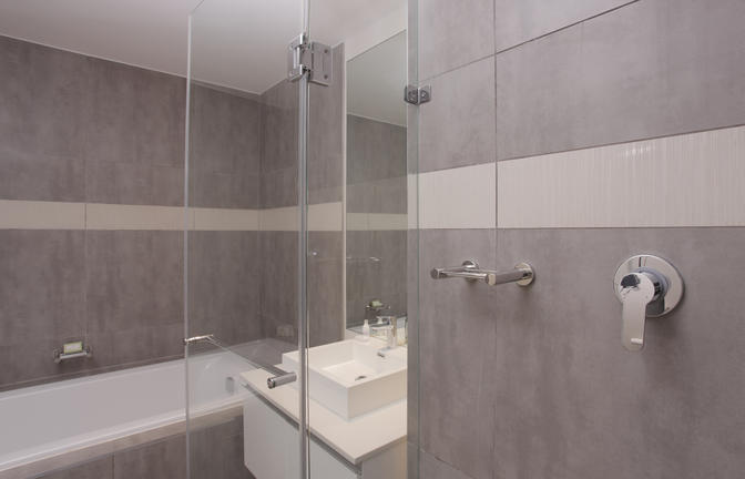 sized bed or twin set. The en-suite bathroom is equipped with a shower and bath. The apartment is complemented by a modern