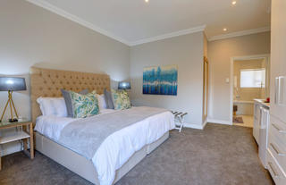 Luxuriöses Zimmer im Gästehaus Kogman & Keisie mit Queen-Size-Bett (Perkal-Bettwäsche) und Bad mit Dusche. Das Zimmer befindet sich im Erdgeschoss mit Kamin, Mini-Küchenzeile und TV mit DSTV.