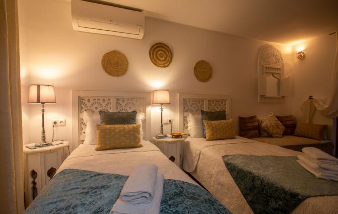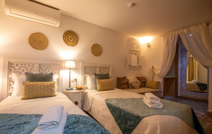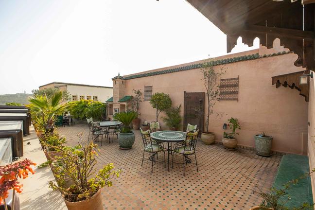 Dès l’entrée, vous serez séduits par la finesse des carreaux de zelliges – ces mosaïques de céramique colorée qui ornent les murs et les sols – ainsi que par les boiseries sculptées et les plafonds travaillés avec un savoir-faire artisanal. Le patio central, baigné de lumière, respire la sérénité et rappelle l’art de vivre des grandes demeures marocaines.
