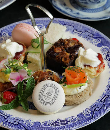 Accompanied by a selection of delicate finger sandwiches, freshly baked scones with rose and strawberry jam, homemade brownies, and our beautiful artisanal macarons.