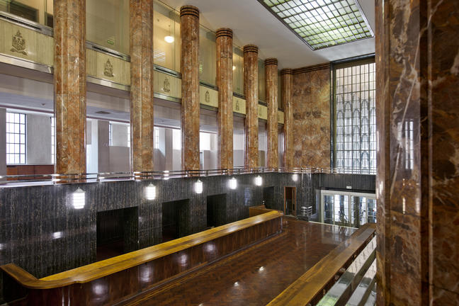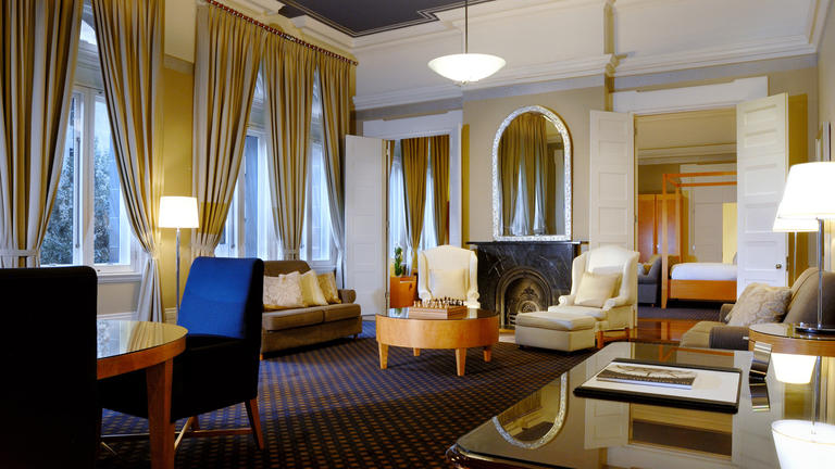 Decorated in subtle hues that reflect its heritage style, the suite boasts tall windows overlooking the picturesque Martin Place. An ornate entry foyer gives way to the expansive living area, in which hardwood floors, a plush navy and gold rug, and six-metre-high ceilings create a peaceful, airy feel. Period features include crown moulding as well as two original, marble fireplaces (for aesthetic enjoyment only).