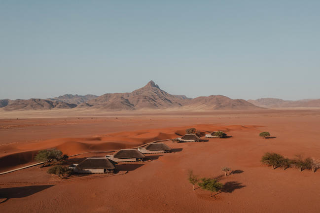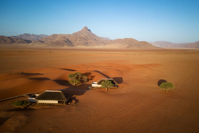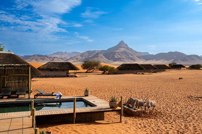 Die Lodge umfasst 20 freistehende, klimatisierte Luxus-Zeltchalets, die mit komfortablen Doppelbetten, privaten Terrassen, Küchenzeilen, elektrischen Anschlüssen sowie eleganten, freistehenden Bädern inklusive Toilettenartikeln ausgestattet sind. Nach einem erlebnisreichen Tag können Gäste im hauseigenen Restaurant köstliche namibische Spezialitäten geniessen, an der stimmungsvollen Bar mit einem kühlen Drink entspannen oder im Pool mit Blick auf die Elim-Düne Erfrischung finden.