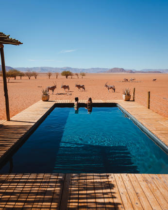 Von den Zimmern, dem zentralen Lodge-Bereich und dem Swimmingpool eröffnet sich ein atemberaubender Blick über die endlose Weite der Wüste.