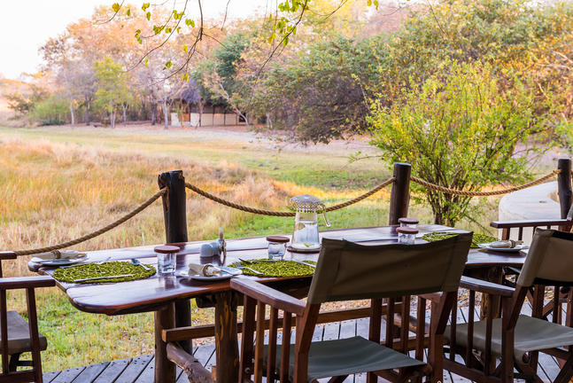 The bedroom platforms have romantic and rustic four poster beds (one queen and one king which can be split into two twin beds), open front walls and uninterrupted views of Africa. Each bedroom has an open air bathroom platform down a short flight of steps with hot shower, flush toilets and basin. A large sofa, armchairs and throw cushions are spread out on the middle deck for relaxing during the heat of the day and watching the game which wanders past the house, oblivious to your presence. There is also a dining table should guests prefer to dine at the house. A fridge and bar are provided in the treehouse as well as tea and coffee-making facilities. A hand-held radio is provided, so that guests can call for a vehicle to bring them to the pool, restaurant or bar, or in case there is a problem of any kind. Their safari guide will otherwise plan with them when they would like collecting from the house and their preferred activities.