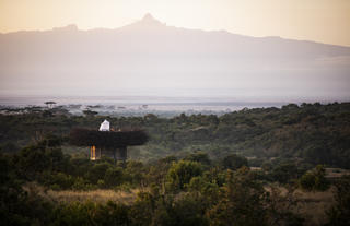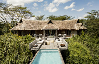 This two-bedroomed, two-building villa is perfect for honeymooners or families wanting absolute privacy—both rooms are generously sized with lovely en-suite bathrooms. They’re built on stilts connected by suspended walkways and both hover above the open-air living and dining space alongside a beautiful private pool. One octagonally shaped bedroom and one square bedroom give multiple angles of views across the river, the plains and Mount Kenya beyond. The waterhole and salt-lick in front of the villa make it a wonderful place to sit and watch wildlife from your verandah.