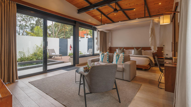 All of the suites have uninterrupted views of the volcanoes and forested national park. Each suite has been designed as a luxurious refuge for post-trek relaxation with a cosy sitting area warmed by a fireplace. Thoughtful in-room conveniences include a well-stocked pantry and minibar and a private dining space. The bedrooms (configured as a super king double or twin), have a rest area, dressing room with double vanity, and a spacious bathroom with a bath, separate toilet, indoor shower and glass-enclosed outdoor shower. A private terrace with a fireplace and heated plunge pool encourages closer engagement with the surrounding landscape.