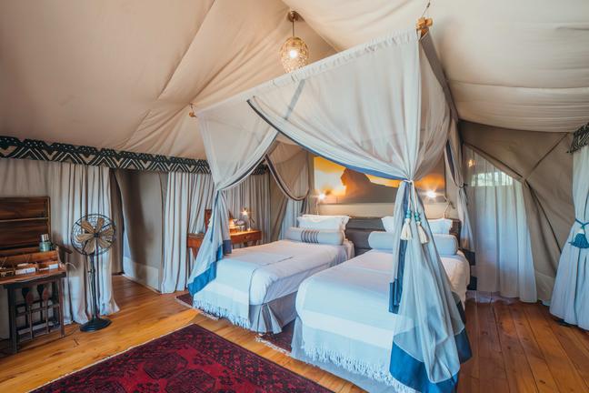 The 2-Bedroom Family canvas tent is custom-designed and sits on a slightly raised platform. It consists of two bedrooms, each with their own separate bathroom, dressing and washbasin areas;