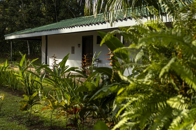 Our seven rainforest bungalows offer air conditioning as well as ceiling fans and screened windows. Discreetly tucked into the forest uphill from the botanical garden, they are across the road from the River Lodge and public areas. The secluded location affords a peaceful ambiance for relaxing and keeping an eye out for wandering wildlife. The bungalows are great for honeymooners and those desiring a little extra comfort and privacy while experiencing the wonder of the rainforest.