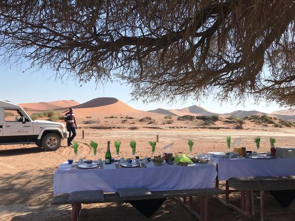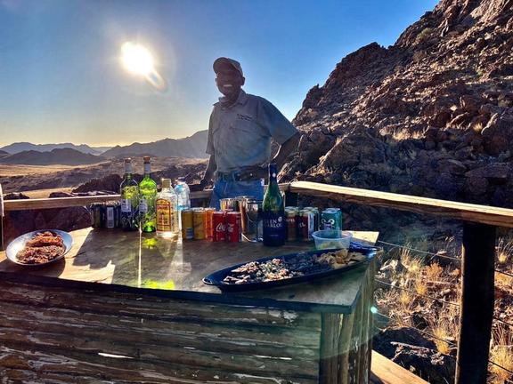 It is a classic Namibian moment, drinks, scenery, and sunset in the heart of the desert.