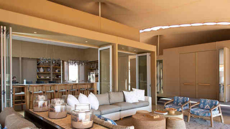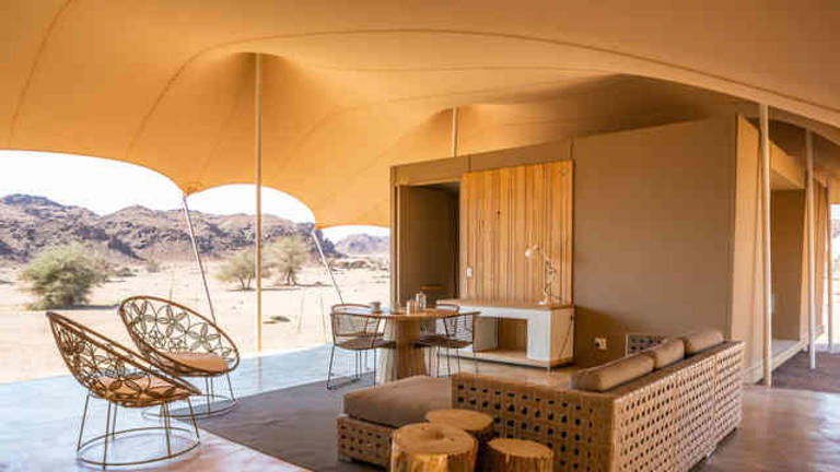 Les dix tentes confortables de style safari se composent de huit chambres doubles, d'une chambre lune de miel avec un lit queen-size et d'une chambre familiale à quatre lits, toutes équipées d'une salle de bain privative. Les tentes sont équipées de lampes électriques et de moustiquaires aux fenêtres et aux portes. Les patios ombragés devant les tentes donnent sur le fleuve Kunene qui se jette dans l'océan Atlantique.