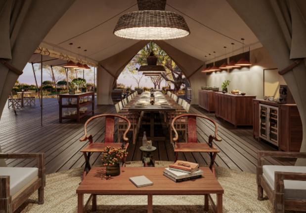The main lodge area is designed as a welcoming hub where guests can relax and share their safari experiences. A combination of open-air and covered dining spaces caters to both communal and private meals, while the lounge and bar areas provide comfortable spots to unwind. Outside, an inviting swimming pool with a shaded gazebo overlooks the surrounding wilderness, and an elevated fire pit creates the perfect setting for evening gatherings under the stars. Thoughtful touches such as a curio shop and expansive viewing decks enhance the overall experience, ensuring that time spent in camp is just as memorable as time spent exploring the Delta.