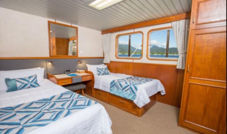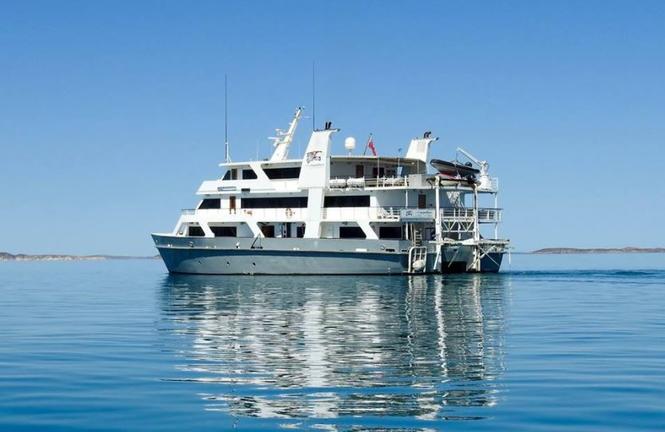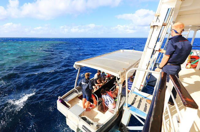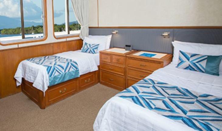 Based in Cairns, the Coral Expeditions II is a small ship that takes her passengers on three-, four-, and seven-night cruises to discover the Great Barrier Reef. The vessel can host up to 44 guests and is small enough to allow snorkelling directly from the ship. The 22 onboard rooms are fitted with twin or double beds and feature large picture windows and private en-suite bathrooms. Meals are served in the dining room, and guests can relax and enjoy a drink at the cocktail bar in the ship’s spacious lounge which features a reference library and plasma screens. The large Sun Deck with its comfortable sun loungers is a favoured place to relax and take in the sights, and also, to enjoy al fresco dinners under the stars. There is also a small gift shop and facilities for scuba diving. The vessel also has a glass-bottom boat and kayaks for marine exploration.
