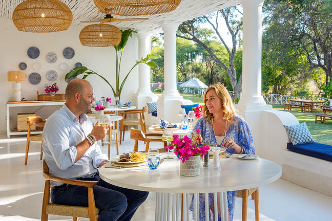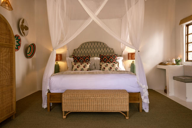 Mit seinen strohgedeckten, hohen Decken und hohen Torbögen empfängt das Hotel viel Licht und vermittelt ein Gefühl von Ruhe und Weite. Moderne, minimalistische Innenräume mit hellblauen, weißen und natürlichen Brauntönen werden durch große, großzügige Veranden mit Blick auf Rasenflächen, deren Schatten von Bleiholz und Regenbäumen gesprenkelt sind, akzentuiert.
