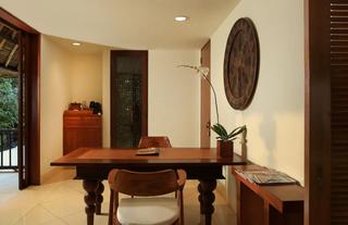 Echoing the sustainable architecture of the Resort’s impressive communal structures, the Beach Club’s restaurant & bar is housed within an open-sided bamboo edifice. Here, a striking framework of bamboo columns and beams creates an interesting play of vertical, horizontal and diagonal lines, which twist, intensify and surprise under the organic curves of the soaring ‘alang-alang’ grass roof. Furnishings also showcase the natural aesthetic beauty of bamboo, introducing hanging lanterns, bamboo chairs, and blond-wood tables with a distressed-antique finish. This simple rustic style has been carefully chosen to ensure that nothing detracts from the spectacular vista of mountains, mangroves, the gentle waters of the bay, and Pasir Putih ‘white sand’ Beach.
