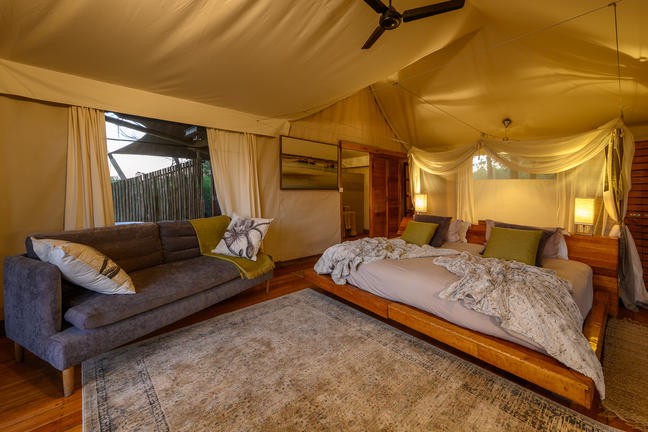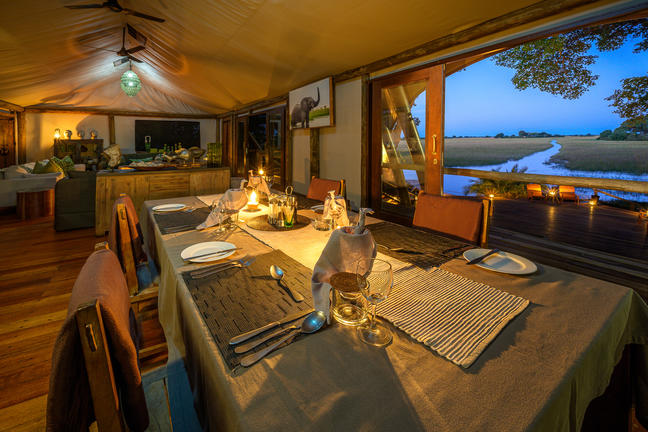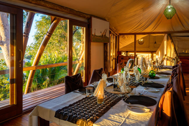 Of the five meru-style guest tents, each decorated in a distinctive and appealing style, two are specifically designed for families having adjoining bedrooms and a shared en-suite bathroom. The dining area, lounge and pool have a glorious vantage over the small lediba (a lagoon within a channel) after which the camp is named and lend themselves to recounting exciting safari tales.