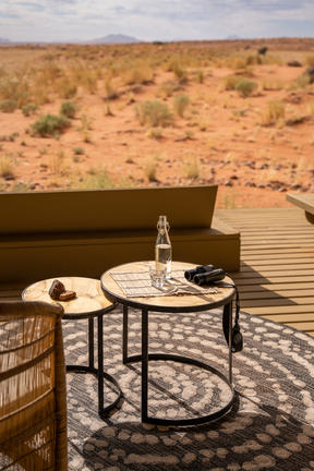 The Private Suite is ideally suited to two couples or a family. It has two rooms with indoor and outdoor en-suite bathroom, and a sala with two single beds for children (sharing the bathroom with adults). A Wolwedans chiller welcomes you on each of the private decks leading out to exceptional uninterrupted views of the desert.