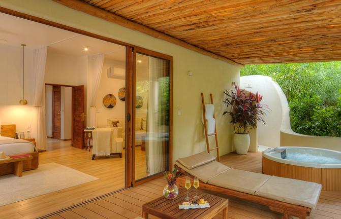 ?Eight palm-thatched tented chalets on wooden decks blend into the forest. In each, a spacious furnished veranda leads to the bedroom, which features a king-size bed and a comfy armchair.