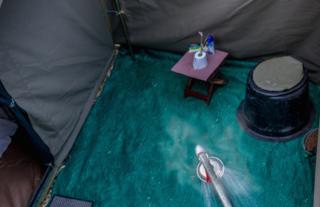 C'est dans ce fabuleux cadre que sera monté pour vous le camp mobile composé de spacieuses et confortables 'Meru Tents Style' avec salle de bain en suite et douche en suite avec système de seau d’eau chaude surélevé. Chaque tente est équipée de lit avec coussin et duvet, petit table de nuit et petit bassin d’eau chaude à l’extérieure de la tente.