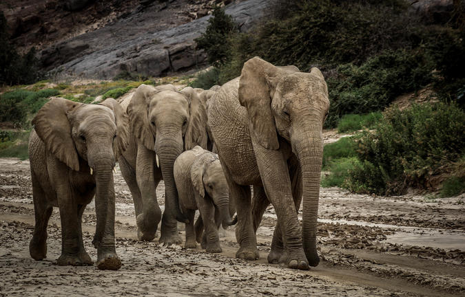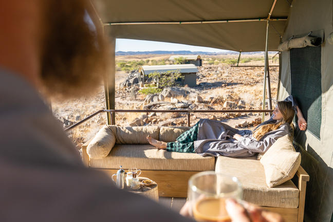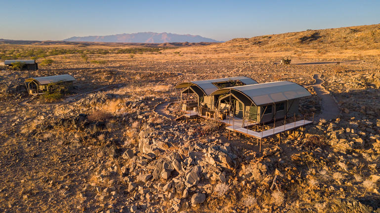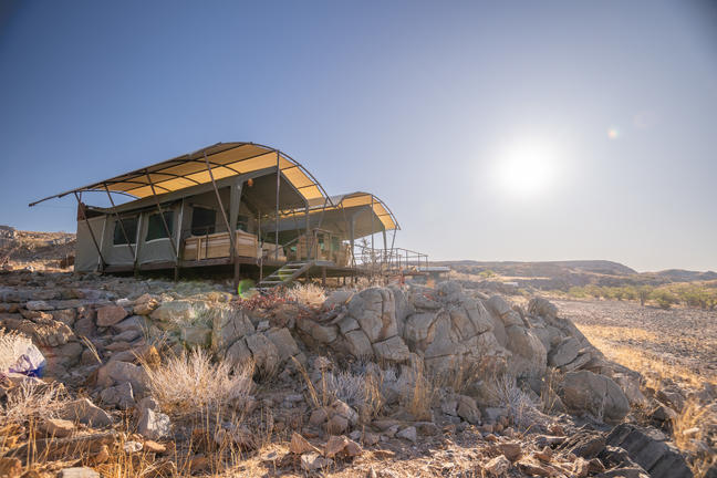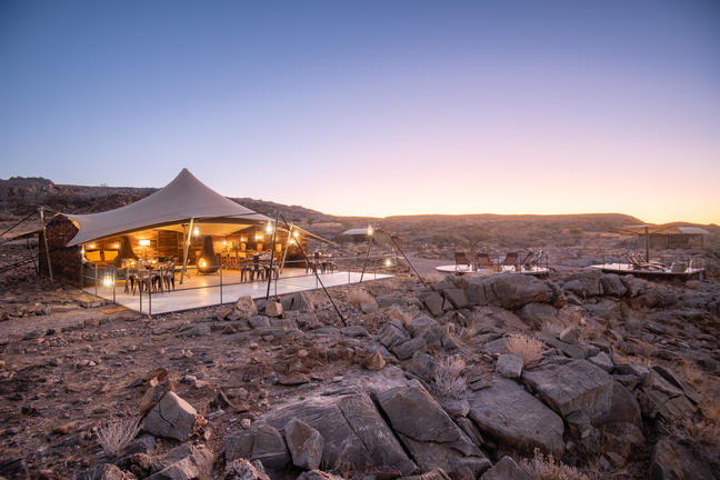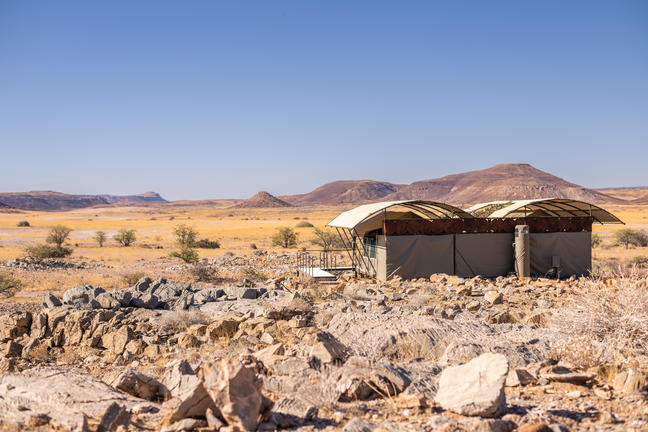 Camp Doros is deliberately small and intimate, and it is located in a core area for desert adapted black rhino with activities largely focused on tracking black rhino with an experienced and qualified Rhino Ranger team. Camp Doros is perched on a high bank overlooking a (generally) dry riverbed and groves of Mopane trees in the heart of Damaraland. Protected from the prevailing winds, the camp carries arguably the lowest environmental footprint of any camp in Namibia. The camp also has a spacious common area including bar serving area, dining room, lounge with fireplaces and a campfire deck, as well as a welcome plunge pool and sun deck. There is a focus on personalized service delivery, and this includes hearty and scrumptious meals which are prepared in a largely solar and wood-fired kitchen. The essence of the camp is immersive exploration of this incredible area.