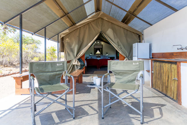 Wild Camping Hoanib liegt am Fluss Hoanib im nördlichen Teil der privaten Palmwag Konzession. Der voll solarbetriebene Campingplatz verfügt über 8 große Zelte mit eigenem Bad, einen großen Gemeinschaftsbereich und einen Pool mit Blick auf das Tal, das bis zum fast immer trockenen Fluss Hoanib abfällt. Die Gäste können sowohl bei Tag als auch bei Nacht Wildfahrten erleben, die die abgelegene Gegend erkunden und sich entlang des schmalen Vegetationsbandes des des Flussbettes bewegen, wo eine überraschende Fülle an Wüstentieren gefunden werden kann, und besuchen Sie die unverzeihliche Skelettküste mit ihren Überresten des Schiffswracks und lauten Kolonien von Kappelz. Dichtungen.