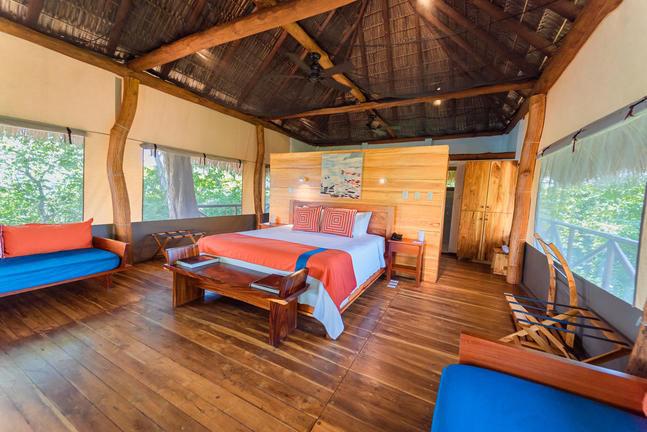 Isla Chiquita Glamping Costa Rica is located on the shores of Costa Rica’s Gulf of Nicoya. Each of the 18 glamping tents features a king bed with a daybed or two double beds, a private shower and bathroom with double sinks, a spacious lounging deck with stunning forest or ocean views.
