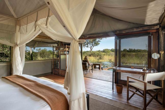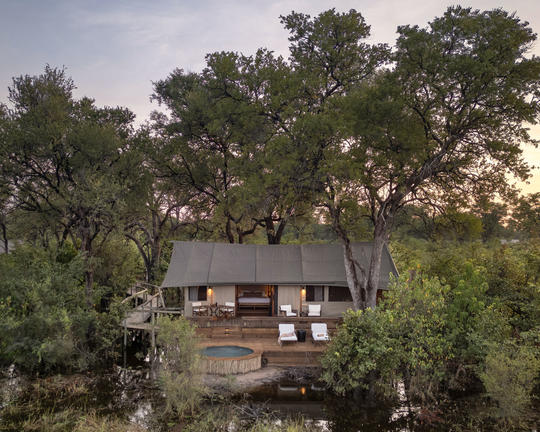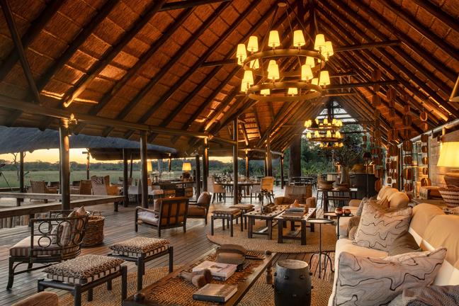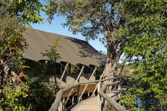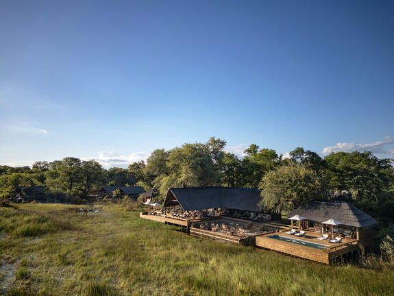The main lodge area is designed as a welcoming hub where guests can relax and share their safari experiences. A combination of open-air and covered dining spaces caters to both communal and private meals, while the lounge and bar areas provide comfortable spots to unwind. Outside, an inviting swimming pool with a shaded gazebo overlooks the surrounding wilderness, and an elevated fire pit creates the perfect setting for evening gatherings under the stars. Thoughtful touches such as a curio shop and expansive viewing decks enhance the overall experience, ensuring that time spent in camp is just as memorable as time spent exploring the Delta.