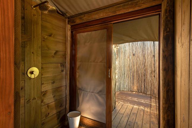 Camp Kalahari has 12 Meru tents; twin tents, double tents and family units comprising two twin tents with an inter-leading bathroom. All tents have en-suite outdoor bathrooms, flush toilets and the hottest, wettest showers in the Kalahari. The tent interiors are classic old safari style, replete with comfy beds, crunchy cotton sheets, duvet and hot water bottles in winter. The main area, in the style of original explorer camps, comprises a large and comfortable thatched library, lounge and dining area; here guests can relax and enjoy the serenity and peace of this enchanting place.