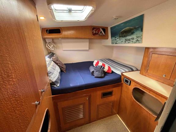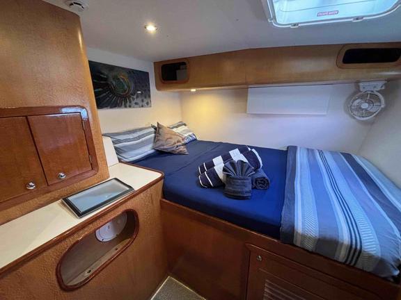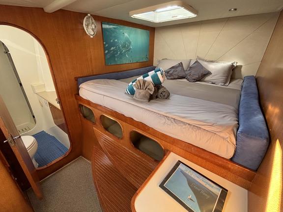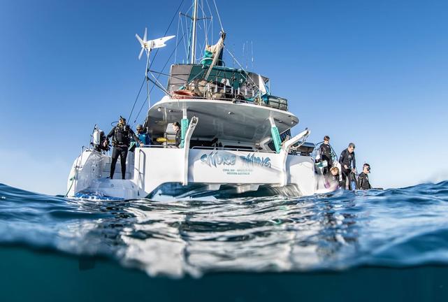 Sail Ningaloo presents Shore Thing, a custom-designed 51-foot sailing catamaran built for exceptional comfort and stability, providing a unique and intimate live-aboard experience. Guests can relax in beautifully appointed cabins featuring private facilities, fresh air circulation, and luxuriously soft bamboo sheets. The spacious saloon and shaded back deck provide a welcoming setting for alfresco dining, complemented by a full desalination unit ensuring a fresh water supply. Entertainment options include snorkelling, scuba diving, kayaking, and stand-up paddleboarding, with expert crew assistance. The elevated helm and forward deck offer stunning views, making Shore Thing an ideal vessel for exploring the wonders of the Ningaloo Reef.