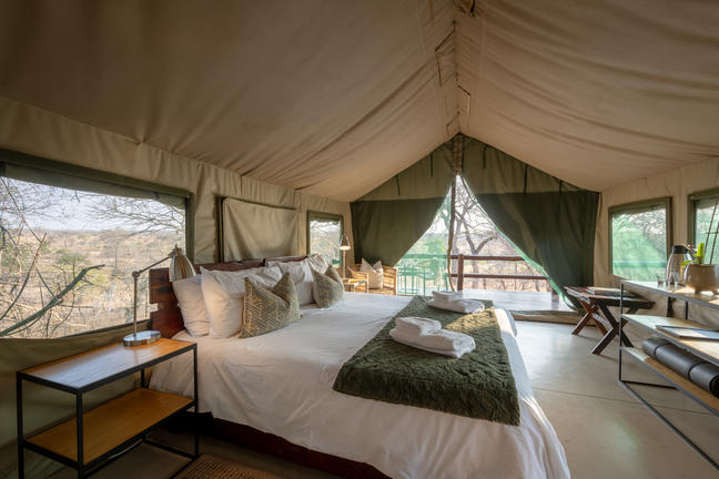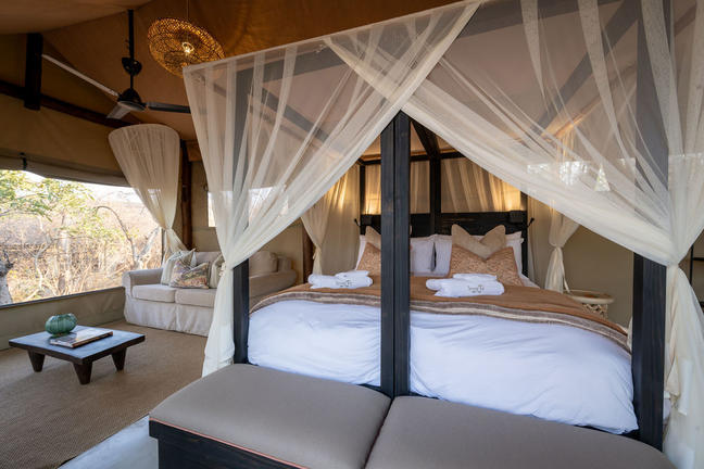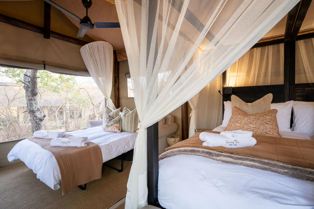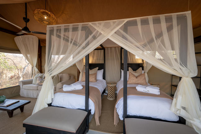 Two Luxury Tented Suites, ideal for a romantic getaway or a family experience. The one suite includes a queen bed with lounge area for relaxation; the other suite has the twin and king set up possibilities and again ideal for a more private or family set up.