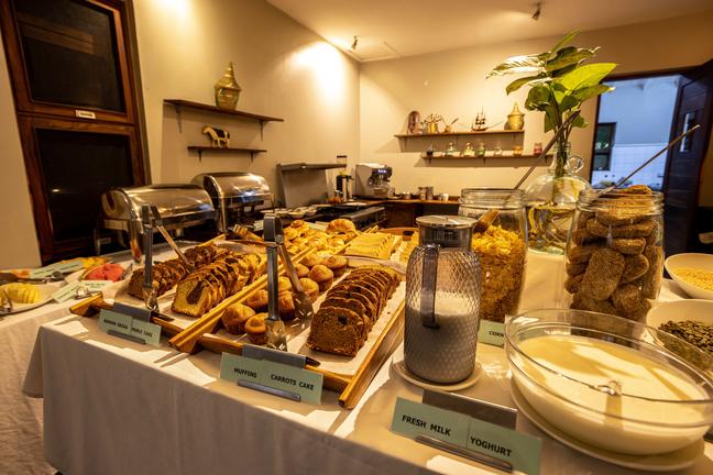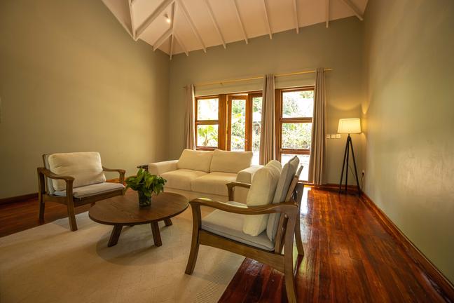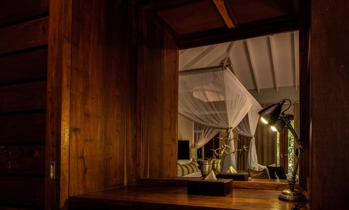 The bedroom area is ample and tastefully furnished. The bathroom area with twin washbasins, a standalone bath and an outside shower is separated from the bedroom area by way of a screen. Guests can enjoy a relaxing bath or take a shower under the stars.