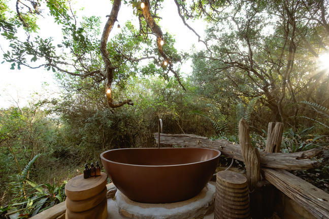 Large windows fill the space with natural light, and a wood-burning fire place adds warmth in cooler weather. The outdoor bath and open-air shower add a unique element to your stay, bringing you closer to the sights and sounds of the bush without sacrificing privacy.