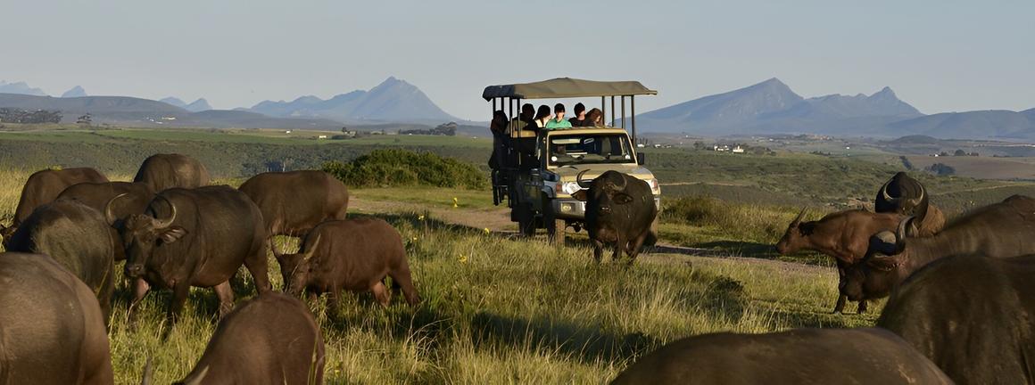 Botlierskop Private Game Reserve offers Guided Game Drives that immerse visitors in a classic Garden Route safari experience across its expansive wilderness. Participants set out in open safari vehicles to track free-roaming wildlife, with the chance to spot iconic species such as rhino, lion, elephant, buffalo, giraffe and the rare black impala, among more than 26 animal species and over 200 resident birds. The drives traverse diverse landscapes framed by the Outeniqua Mountains, providing dramatic scenery and close wildlife encounters.