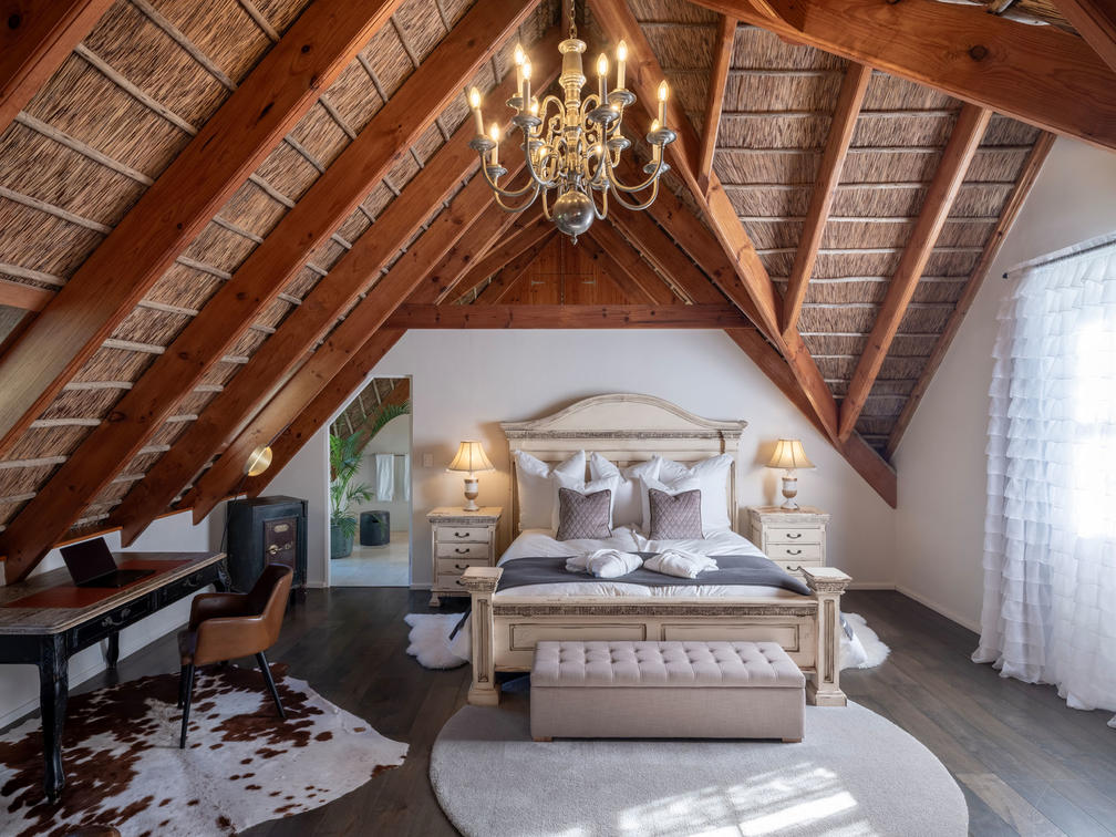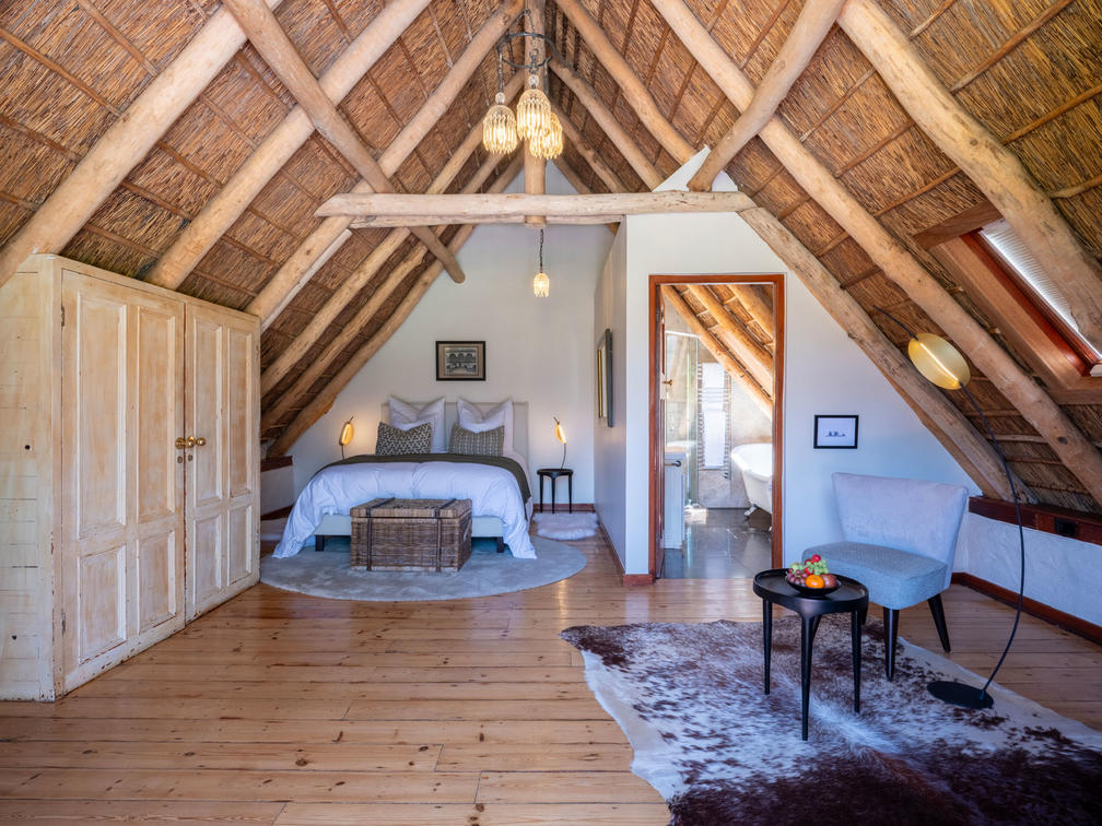 This 41 m² suite with a thatched roof is located in the historic Jacaranda House. The cosy bedroom features a king size bed, a marble bathroom, and a separate living room, as well as a small balcony providing stunning views of the property and the mountains.