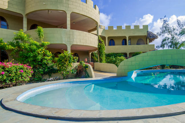 Set in beautifully landscaped gardens, Watamu Castle is entered by following ‘the yellow brick road’ over a humpbacked bridge spanning the swimming pool. On the second row from the beach, the house is fun and unique, spread over three floors.
