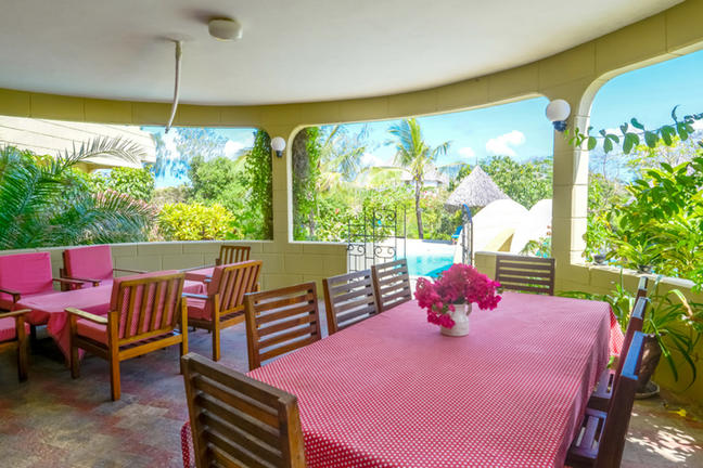 Dzumbe House is a deluxe villa and has five bedrooms each with their own private bathrooms, located right on the Diani Beach strip, simply amazing. 3 bedrooms have double beds, 2 bedrooms have single beds and it can sleep a maximum of ten.