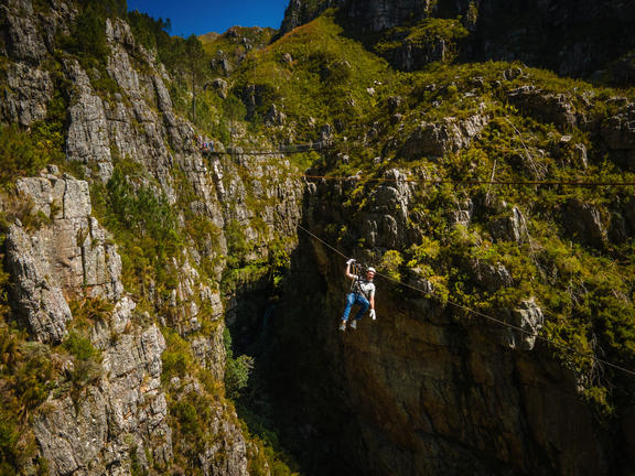 Once in the mountains, soar through eleven thrilling ziplines, some over 300 metres long, each ending on cliffside platforms above the Riviersonderend Gorge. A highlight of the tour is crossing a suspension bridge over a narrow sandstone ravine above a double waterfall – a truly unforgettable experience.