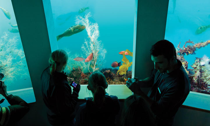 Descend 64 steps (10 metres) underwater into a large, fully air conditioned viewing area where large windows with excellent optical clarity open your eyes to this deep underwater haven. Unlike an aquarium, the fish are free to come and go; it’s the people who are contained.