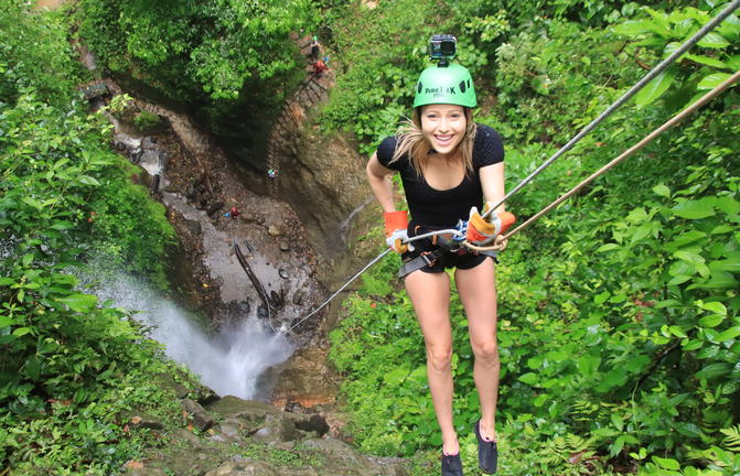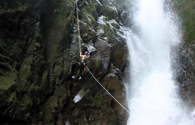 After a short 5 minutes hike, you will arrive to the first rappel. There are 4 rappels (3 of them in waterfalls and 1 rock-canyon wall) ranging in heights from 50 meters (130ft) to 20 meters (45ft). Each rappel will be better than the next and there will be a safety line controlled by a guide at the top of each rappel. This will stop from falling if you let go of your rope. You will also have a guide at the bottom of each rappel, controlling the main rappel line for additional support. This part of the excursion takes 2.5 hours approximately and there is funny "monkey drop" (zipline with rappel) where you fall into a natural pool where you will get wet!