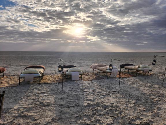 Or embark on an adventure to the Makgadikgadi Pans, where vast salt flats create a surreal, otherworldly landscape—perfect for a magical sundowner. An adventure is a thrilling horse-riding safari for a unique way to explore the bush. To complete the experience, guests can enjoy a traditional bush braai (barbecue) under the stars.