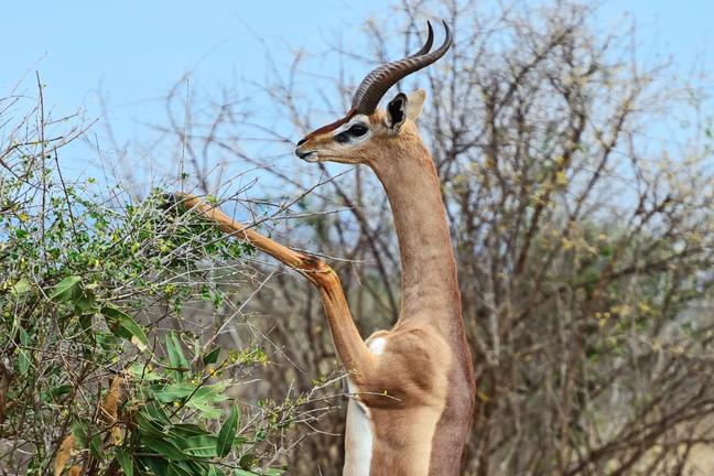 Als je één reservaat bezoekt in het noorden van Kenia, laat het dan Samburu National Reserve zijn. Het gebied barst van het wildleven, inclusief veel aangepaste soorten aan de woestijn, en is ook ongelooflijk schilderachtig: het park is relatief compact, ingekaderd tussen sobere, kale bergen en de vruchtbare oevers van de Ewaso Nyiro-rivier. Je bevindt je hier in het hart van het Samburu-gebied, wat ook een fascinerend cultureel decor biedt.