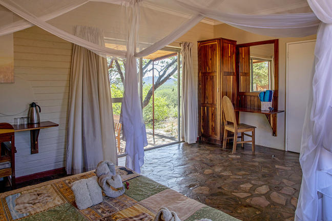 Bambatsi Guest Farm is perched on a hill with breathtaking views of the Mopane Savannah in Namibia. Accommodation options consist of beautifully furnished bungalows with private terraces, mosquito nets, private bathrooms, and cosy beds. Additional accommodation includes a campsite where nature enthusiasts can pitch their tents and make use of the camp facilities, which include barbecue areas, communal terraces, and shared bathrooms. Property facilities include a swimming pool, a bar, and a dining area.