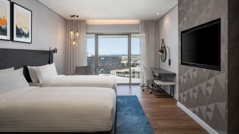 Cape Town Marriott Hotel Crystal Towers is located on the corner of Century Boulevard and Rialto Road in Century City, Cape Town, with access to the Robben Island Museum, the Durbanville Wine Valley, Table Mountain Cableway, and Blouberg Beach. The hotel offers well-appointed rooms and suites featuring private bathrooms, hairdryers, air conditioning, ironing facilities, tea/coffee makers, mini-fridges, TVs, and workspaces. A complimentary buffet breakfast is available on-site. Facilities and services include dining and drinking establishments, a spa, a swimming pool, laundry facilities, meeting/event facilities, wake-up calls, turndown services, daily housekeeping, room service, and Wi-Fi.