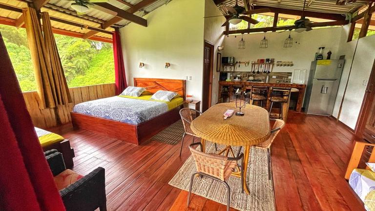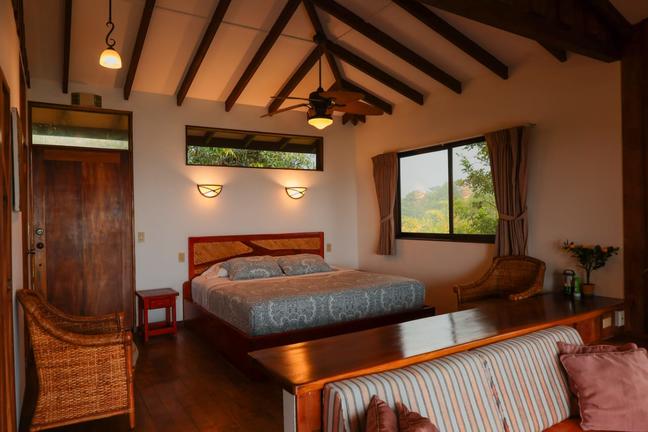 Hohe Gewölbedecken und private Panoramaterrassen bieten einen Blick auf den Nationalpark Manuel Antonio und die Küste. Die Unterkünfte befinden sich auf natürlichen Hangterrassen, die zum Restaurant El Mirador und zur Rezeption führen. Um wertvolle Laubhölzer zu schonen, stammten über 85% des verwendeten Holzes aus landwirtschaftlichen Produkten aus Melina, Teak und Kiefernholz. Im Preis enthalten sind Kingsize-Betten, Sofas, Küchenzeilen und Badezimmer mit geräumigen Schieferduschen.