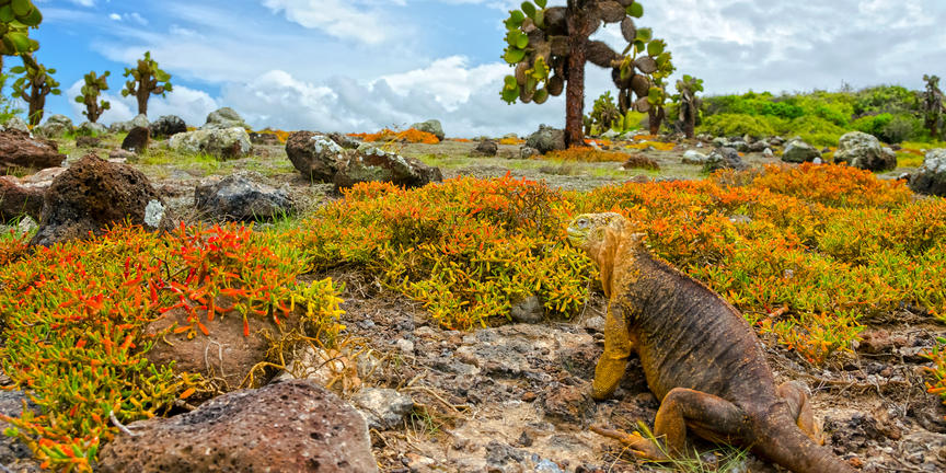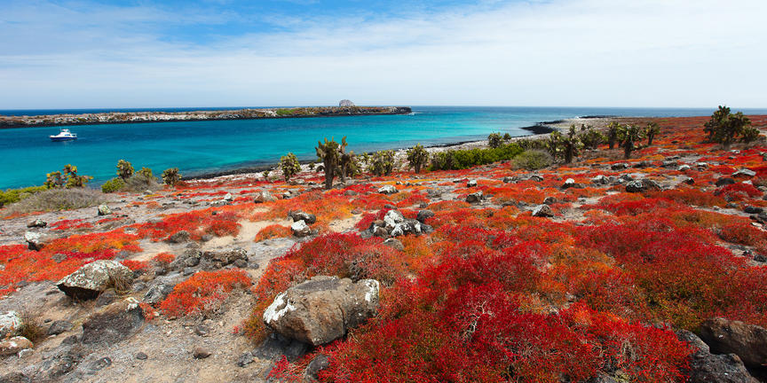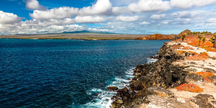 A small, vibrant jewel in the Galápagos archipelago, South Plaza Island is a striking study in contrasts. Its rugged cliffs rise sharply from turquoise waters, while the interior is carpeted with bright orange and green sesuvium plants, creating a kaleidoscope of colours. The island teems with life: colonies of sea lions lounge lazily on sun-warmed rocks, swallow-tailed gulls wheel overhead, and striking land iguanas patrol the sunbaked terrain. Visitors can wander along narrow trails that weave through dramatic cliffs and cactus-studded landscapes, or snorkel in the surrounding waters, where playful fish dart among the waves. The salty tang of the ocean blends with the hum of seabird colonies, offering an intimate sensory experience with one of the Galápagos’ most vibrant and unique islands.