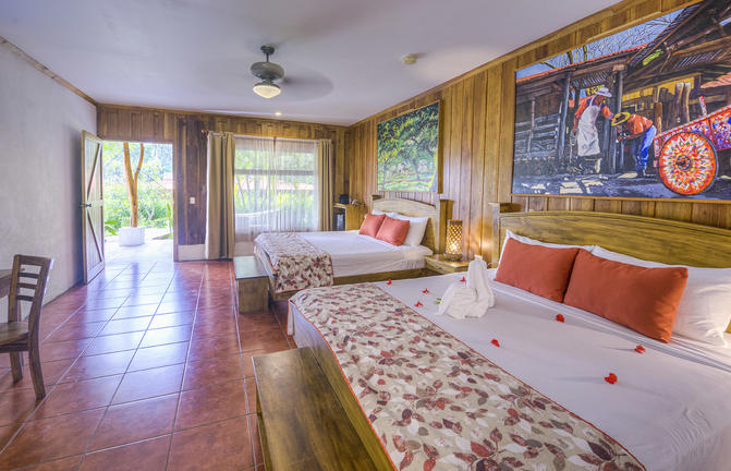 Choose the Superior Queen Room at Hotel Hacienda Guachipelin for a truly exceptional stay, where modern comfort, natural beauty, and convenient access come together to create an unforgettable experience for you and your family.