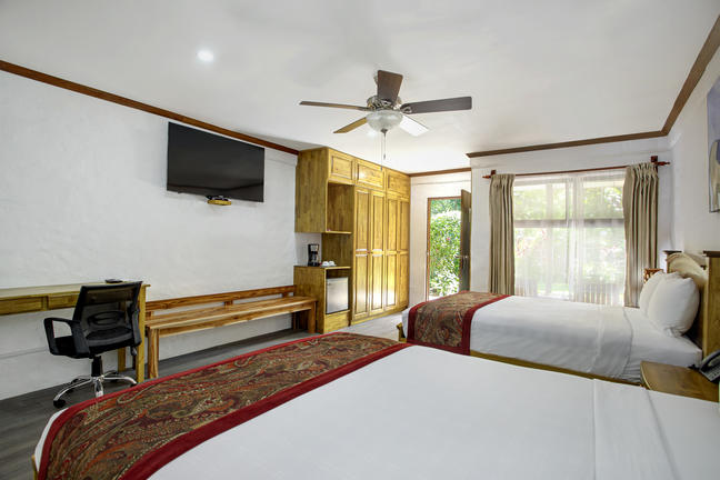 Each room walks out to a shared covered terrace that faces a large, open green space that is ideal for bird watching and photo opportunities. Each Superior Queen Room comes with two queen-sized beds, security box, air conditioning, ceiling fan, mini refrigerator, cable TV, coffee maker, and phone, plus an environmentally friendly solar-powered water heater. Room rates include a full buffet breakfast and access to our on-site Rio Negro Hot Springs and Mud baths.
