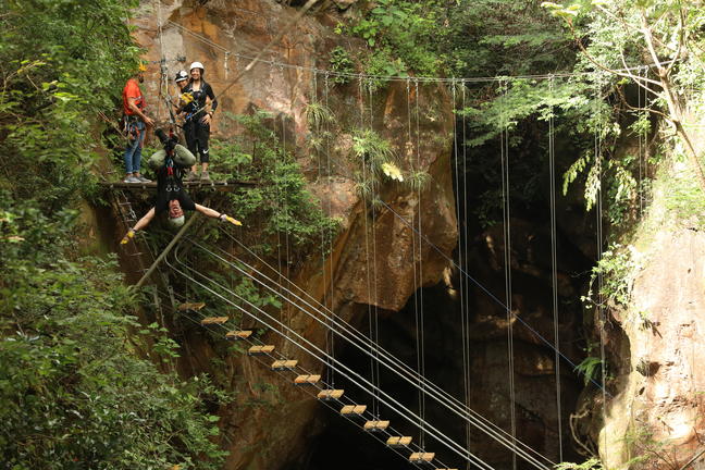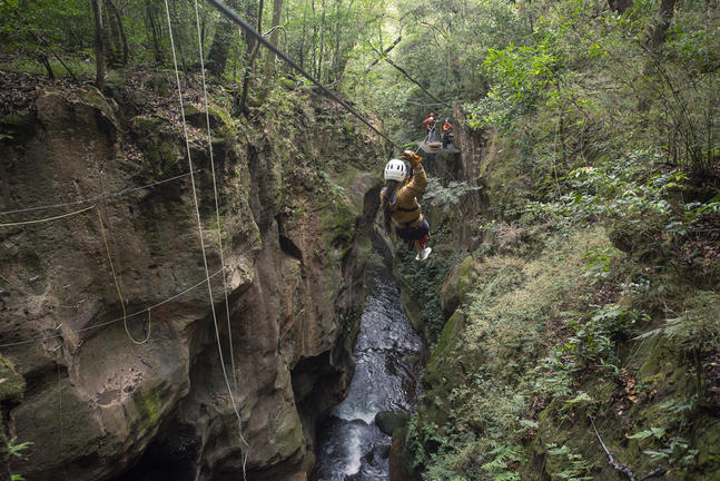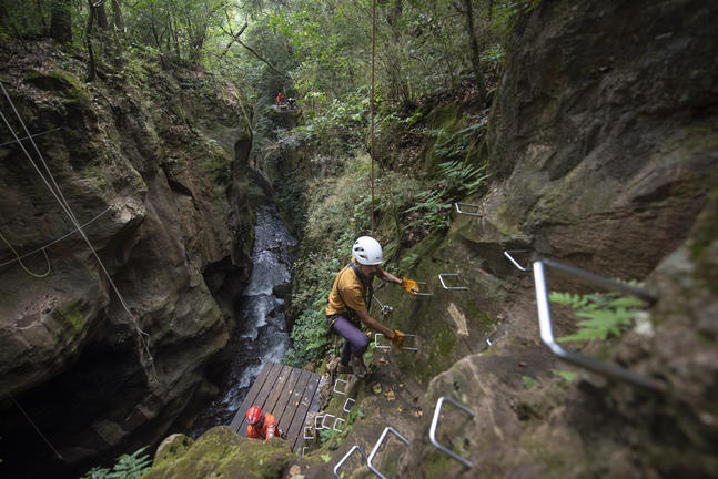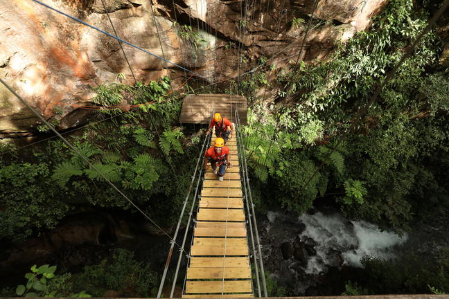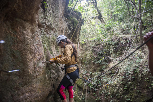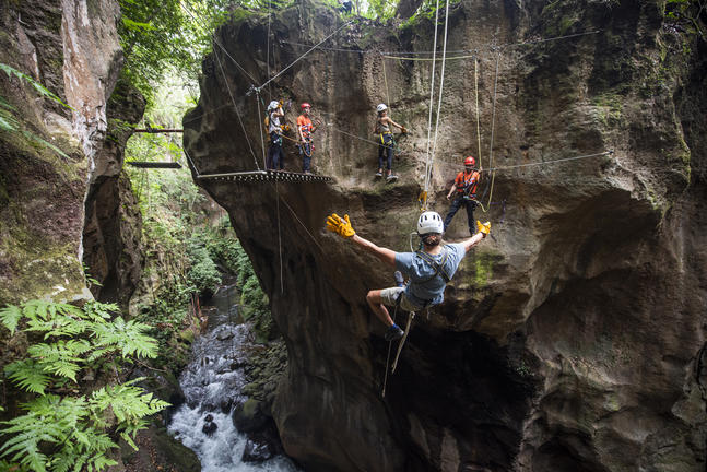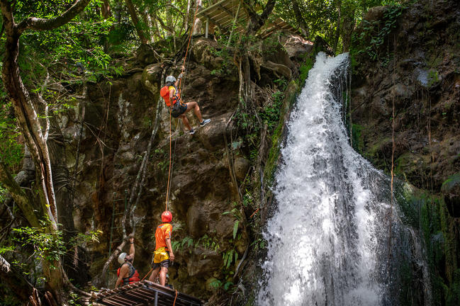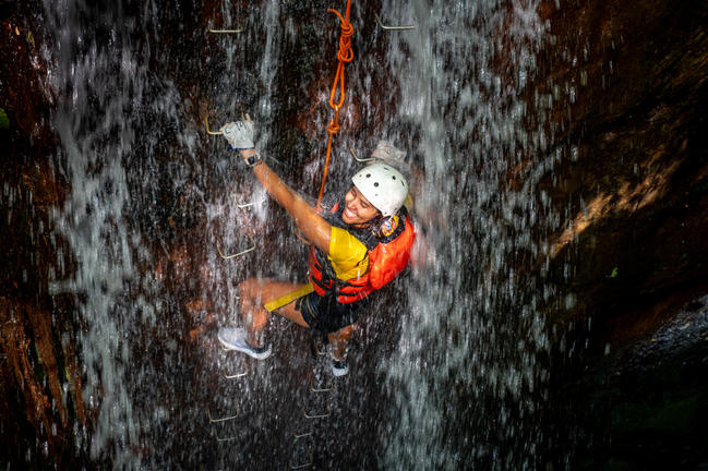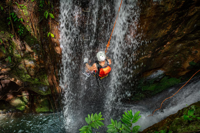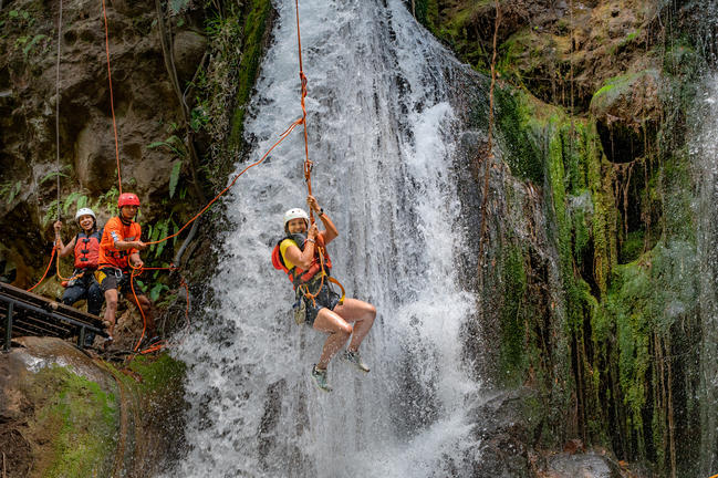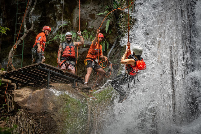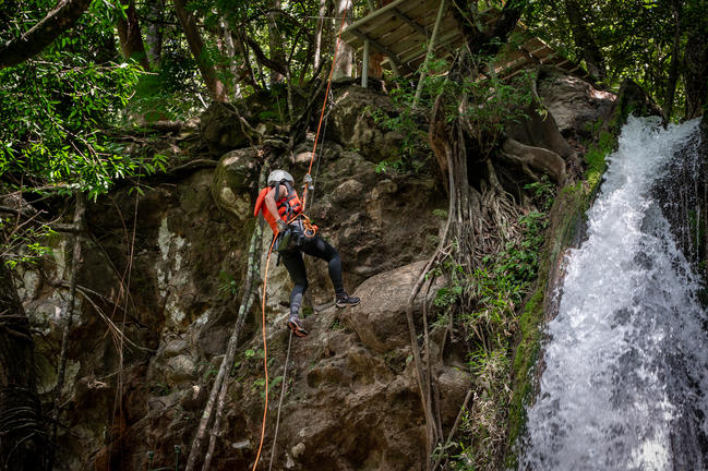 After the first rappel, rock climb assisted by the wall of rock next to the waterfall to go back down on rappel. Then you can make another rappel in a second location and a Tarzan pendulum into the water of the waterfall.