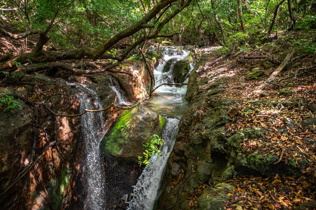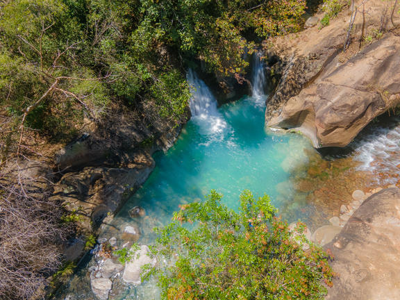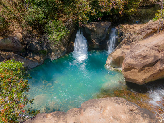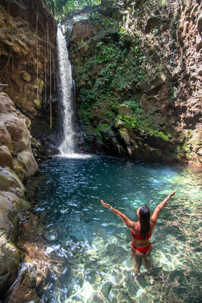Two twin falls cascade into a stunning pool of sky-blue mineral waters. A small canyon of volcanic rock surrounds the falls and the pool, creating an intimate and secluded tropical oasis for a refreshing dip.