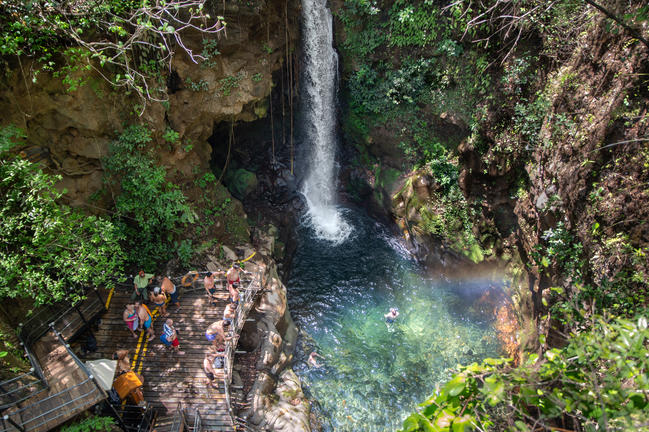 Near the Hotel Hacienda Guachipelin, Las Chorreras waterfall is a beautiful spot where you can unwind in nature and swim in a pool created by a tropical cascade.